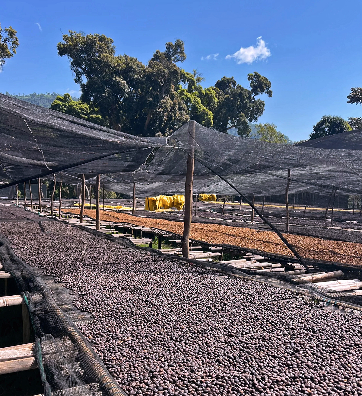 In the natural process, only ripe, shade-grown cherries are accepted at the mill and carefully hand-sorted. They are laid out on raised African beds to dry in the sun for 12 to 15 days. Throughout the process, the cherries are regularly turned to ensure even drying. To preserve quality, they are covered during the hottest hours of the day and protected from moisture and rain at night.